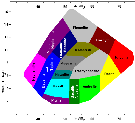 Классификация по содержанию калия на диаграмме SiO2-K2O была предложена для островодужных магм Гиллом [Gill,1981]. Эта классификация основана на том, что при кристаллизационой дифференциации базальтов нормального ряда, калий ведет себя как некогерентный элемент и постоянно накапливается в расплаве. При ассимиляции магмами кислых пород или смешении с кислыми расплавами, калий добавляется примерно в той же пропорции, что и при фракционировании. Поэтому, островодужные серии как правило формируют четкие тренды на диаграмме SiO2-K2O, примерно параллельные разделительным классификационным линиям, которые характеризуют серию в целом, как производную исходной магмы. Эта классификация удобна во многих случаях, так как позволяет определить принадлежность к серии не только дифференциатов, но и вулканических пеплов, тефры и т.д.