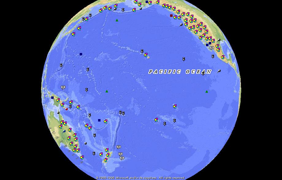 Тихий океан. Минералогические находки (примеры). Составил: А. Евсеев, 2019. Подробнее: Евсеев А.А. Атлас мира для минералога. М., 2004. - 284 с. \\ Сокращение: фд - фото www.mindat.org \\ xls - кристаллы \