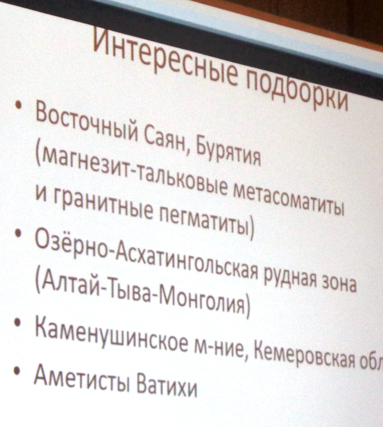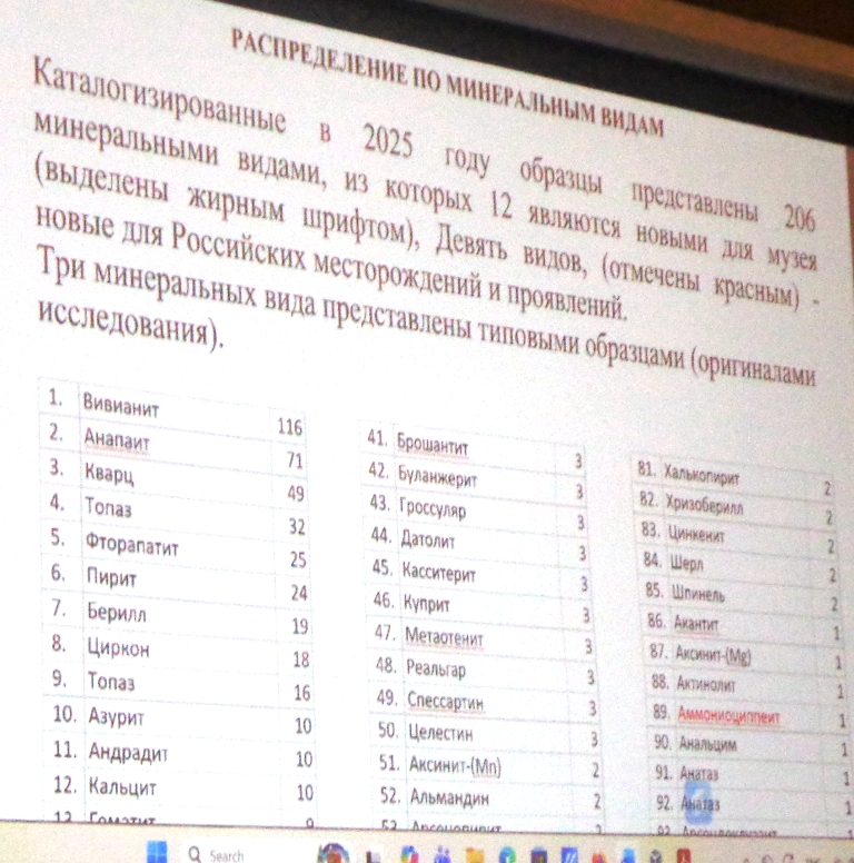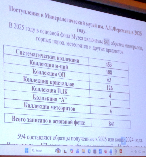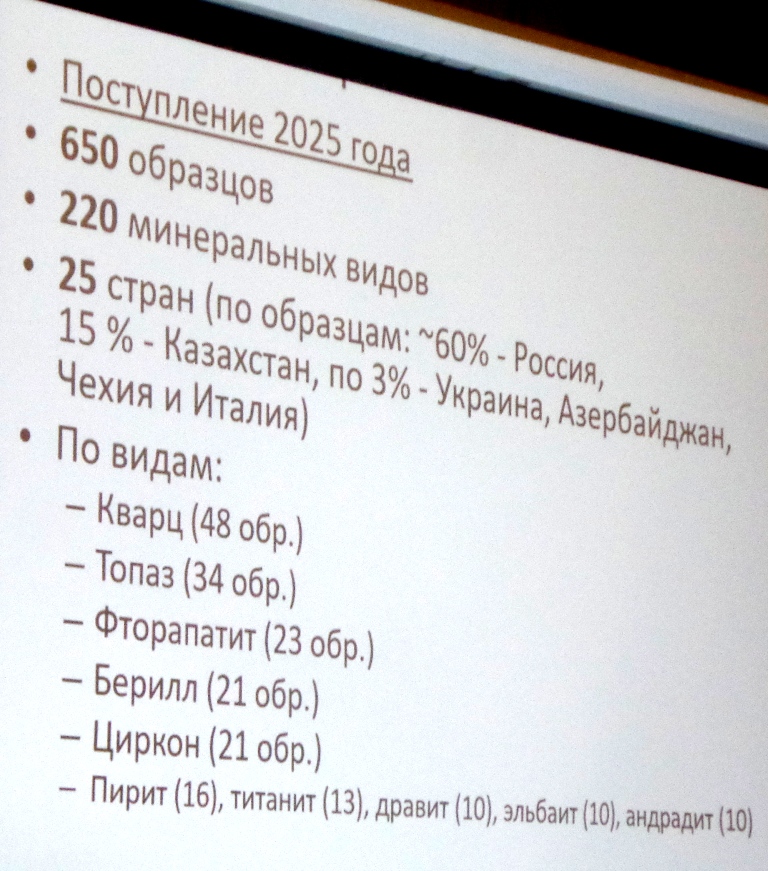 Андрей Карпов представляет новые поступления и Мин. музея. ФМ --образцы из коллекции И. А. Ткаченко. Фото: А. Евсеев. 2025.11.12