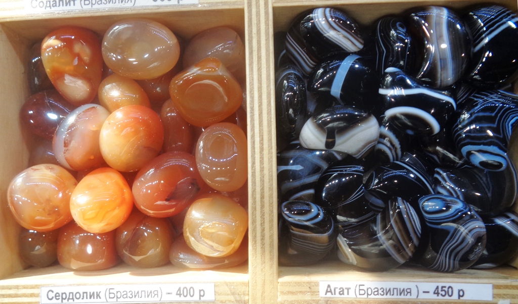 1. Сердолик. Бразилия. 2.Агат. Бразилия. «Ивент-холл Даниловский». Фото: А. Евсеев, 2026.04.04