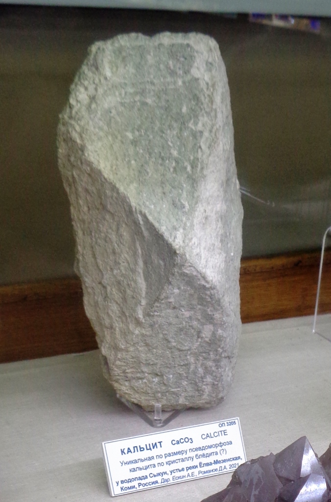 Уникальная по размеру псевдоморфоза кальцита по кристаллу блёдита(?). Район водопада Сыкун, устье р. Елва-Мезенская, Коми, Россия. Образец: ФМ (ОП-3205. Дар. Ескин А.Е., Романов Д.А., 2021 ). Фото: А. Евсеев \\ НМК-258