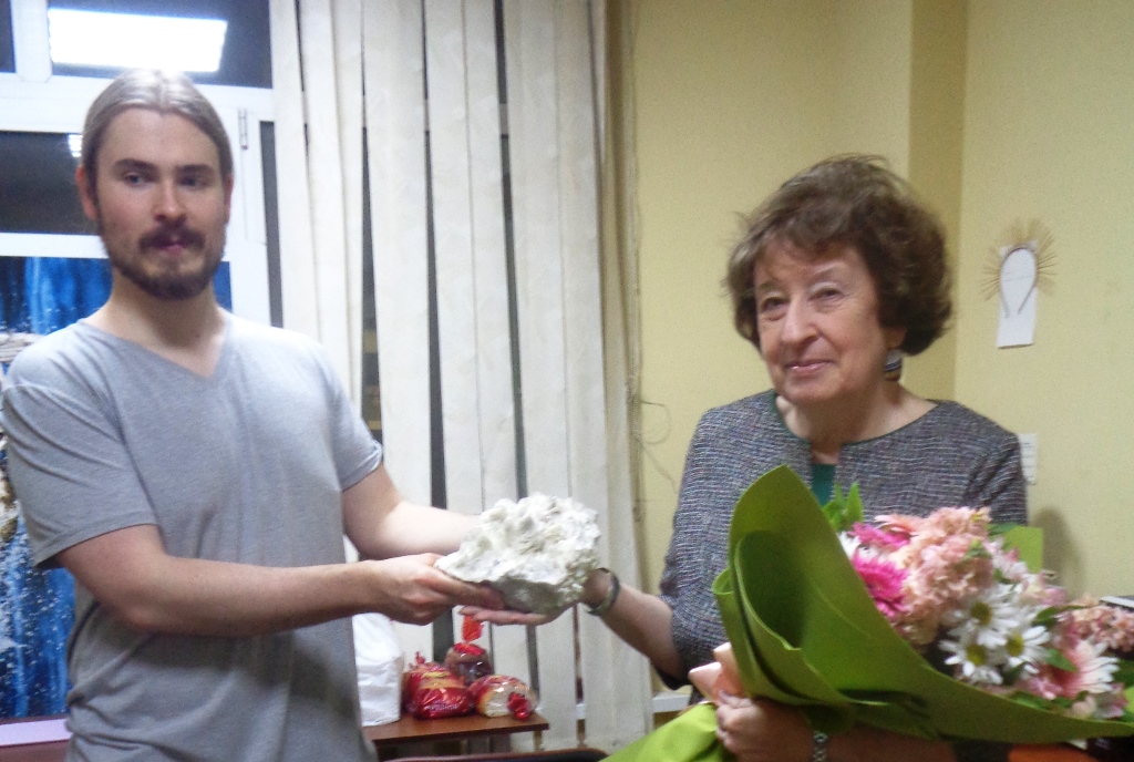 Татьяна Должанская принимает поздравления с днем рождения и образец от Михаила Стрельникова (слева). Мин. музей МГРИ. 2025.12.01. Фото: А. Евсеев