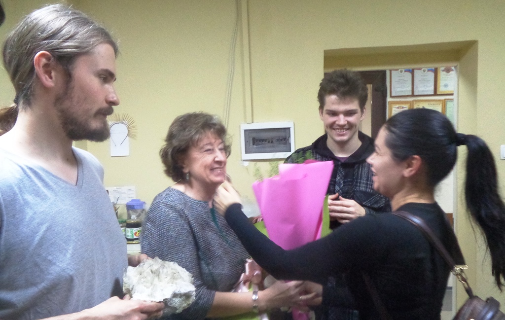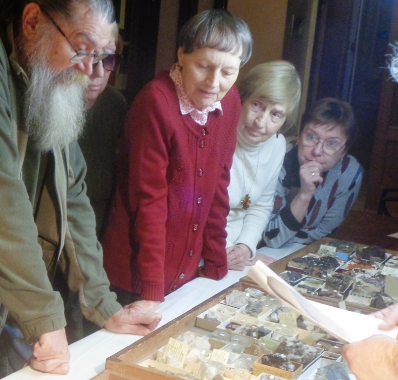 1. Теодора Билярска (слева) проводит экскурсию. 2019.10.15 Отдел минералогии Музея Софийского университета (Болгария). 2. Михаил Малеев (слева) , Светлана Енчева и Петко Петров. Музей "Земля и люди" . 2015.10.12. Фото 1-2: А. Евсеев.