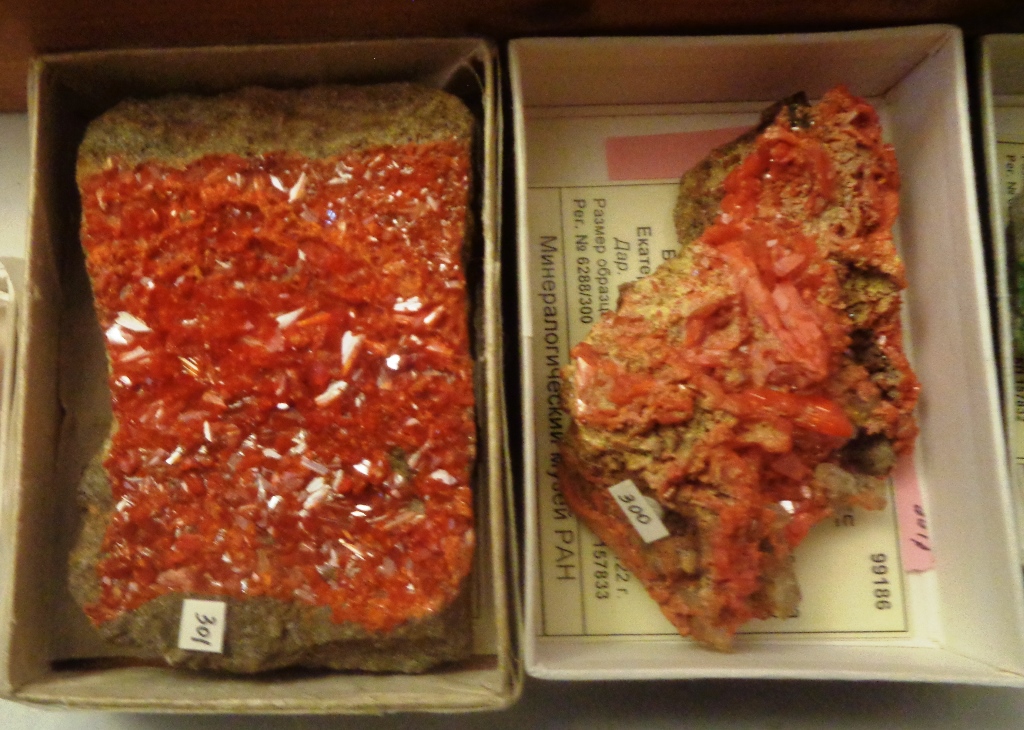 1. Просмотр новых поступлений в собрание ФМ. Образцы из коллекции И.А. Ткаченко (он -слева). 2. Крокоит (Березовское м-ние, Урал). Образцы из коллекции И.А. Ткаченко. 2025.12.01 Фото 1-2: А. Евсеев