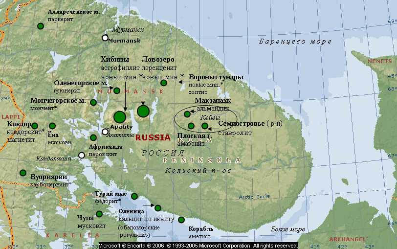 Местонахождения минералов Кольского п-ова и прилегающих территорий с примерами находок. Составил: © А.А. Евсеев. Внимание: название и привязка (положение на карте) некоторых местонахождений требует уточнения (показаны на карте красными и коричневыми значками). Карты предназначены только для образовательных целей. \\ Евсеев А.А. Кольский полуостров. Краткий минералогический путеводитель. // Мир камня, 1995, № 5/6, С. 36-44 (World of Stones, 1995, № 5/6, 64-74)