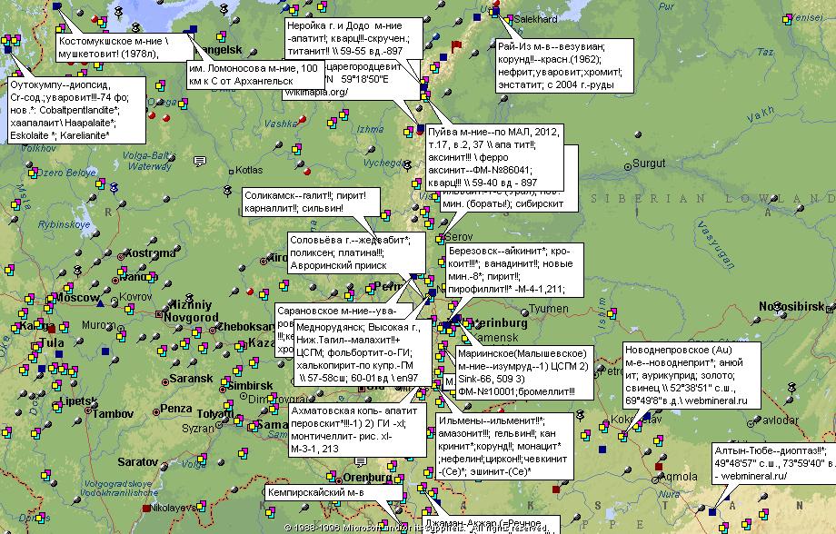 Местонахождения минералов Урала. \\ Подробнее: Евсеев А.А. Урал (от Среднего до Полярного): краткий минералогический путеводитель. - Мир камня (World of Stones), 1993, №2, С. 15-19 (35-41).