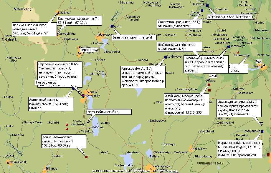 Местонахождения минералов Среднего Урала (р-н к Ю от Екатеринбурга \ Левиха... Изумрудные копи) с примерами находок. Составил: © А.А. Евсеев. Внимание: название и привязка (положение на карте) некоторых местонахождений требует уточнения (показаны на карте красными и коричневыми значками). Карты предназначены только для образовательных целей. Подробнее: Евсеев А.А. Атлас мира для минералога. М., 2004. - 284 с. \\ Евсеев А.А. Атлас для минералога. Россия и бывший СССР . М., 2011. – 248 с