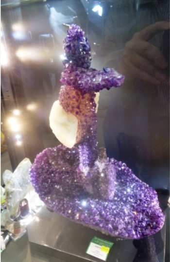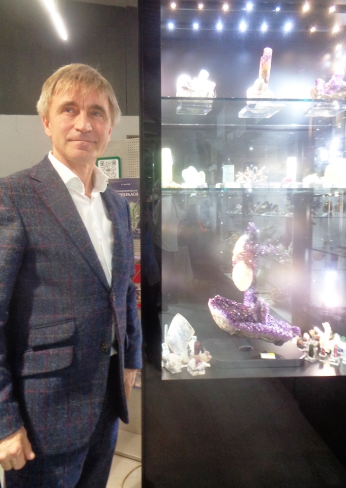 1. Михаил Аносов у витрины компании "Русские минералы " 2025.10.04. Выставочный центр «Ивент-холл Даниловский» . 2. Аметист, кальцит. Артигас, Уругвай. Образец: "Русские минералы". Фото 1-2: © А. Евсеев