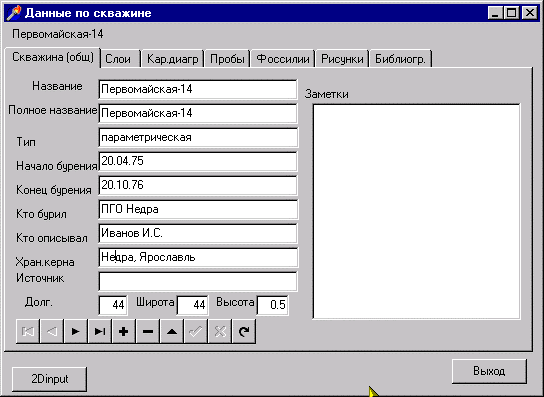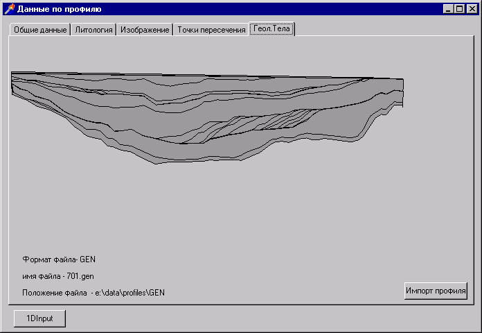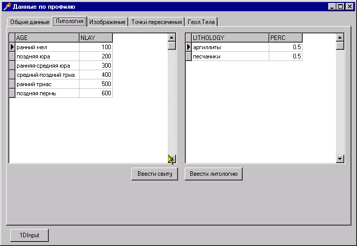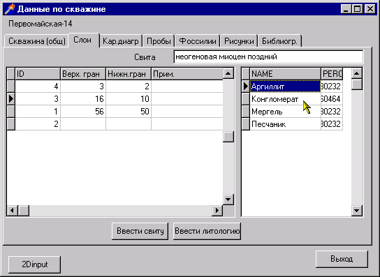 исходных данных обеспечивает ввод численных и текстовых данных (разрез скважины или сводный разрез по полевым наблюдениям), импорт картографических данных наиболее распространенных форматов (таких как форматы AutoCAD, ARC/INFO, ПАРК) редактирование введенных данных и карт, назначение атрибутов графическим объектам. Важной задачей, решаемой на этапе ввода, является датировка слоев и границ, которая может быть основана как на единой геохронологической шкале так и на существующей схемы стратиграфической разбивки к подразделениям листа Госгеолкарты-200 (с возможностью перехода между ними). Разрабатываемый пакет не дублирует функции ввода и хранения картографической информации существующих ГИС и, таким образом, не конкурирует с ними. Он направлен на решении собственных задач и использует ГИС в качестве источника исходного материала и средства для представления выводимых результатов.Введенные первичные данные хранятся в базе данных фактического материала, содержащей информацию о скважинах (мощность, литология, возраст слоев, расположение скважин и др.); профилях и сейсмогеологических разрезах (положение и геометрия геологических и сейсмогеологических границ, возраст и литология и др.); геологическую карту и карту рельефа; карты геофизических полей; структурные карты.