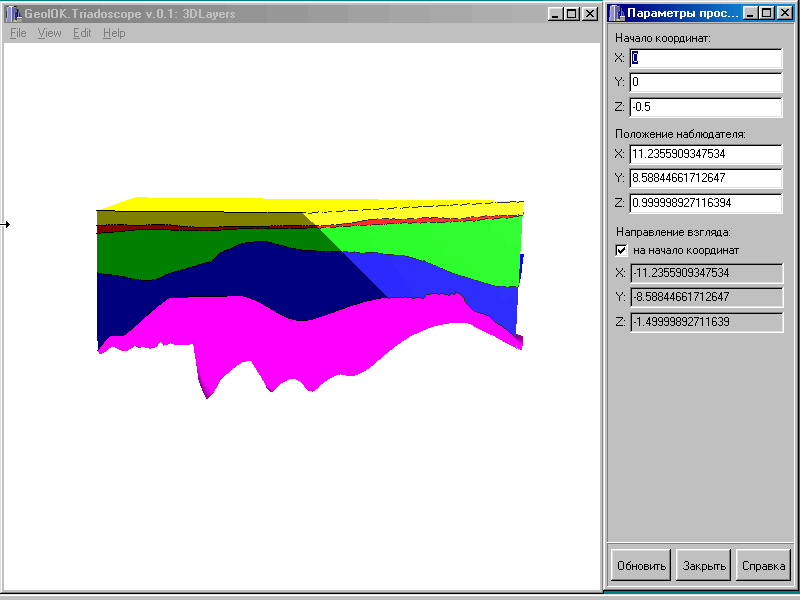 годах под общим руководством А.А. Богданова. Максимально что оказалось возможным добиться таким способом - это нарисовать объемную геологическую структуру на кубиках, из которых складывается, например, пятидесятитысячный лист на глубину до нескольких километров. В этом виде записи объемной геологической среды мы можем извлекая те или иные “кубики” рассмотреть геологическое строение того или иного участка на глубине, но только вдоль поверхностей нарезанных “кубиков”.Для осадочных бассейнов их объемную структуру стало возможно рисовать в виде всевозможных изолиний. Но на плоскости нагромождение линий не позволяет четко анализировать объемную структуру. Тем более, если осадочный бассейн осложнен тектоническими структурами типа надвигов, имеет особые тела в виде рифовых или соляных массивов, то методы изолиний уже применимы с трудом и нужно привлекать методы построения, использованные для построения объемных карт методом глубинных срезов и тому подобное.
