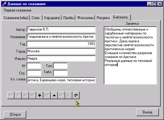 , профилям и картам. Поля ввода каждой из форм разбиты на несколько смысловых групп, доступ к которым осуществляется с помощью соответствующих с закладок. В целом, каждая закладка соответствует одной таблице базы данных. Для подключения словарей служит дополнительная форма, определяющая взаимодействие словарей с основными таблицами.Модуль ввода первичной информации по скважинам содержит следующие закладки: