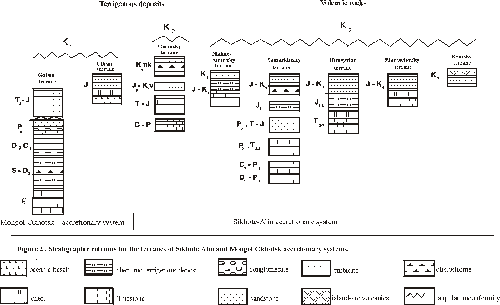 Mesozoic sequences unconformably rest on Paleozoic rocks. They include Upper Triassic-Jurassic shallow-marine coarse-terrigenous rocks which are overlain without angular unconformity by Neocomian continental terrigenous rocks with interlayers of silicic lava and tuff. The source of volcanic material was likely Uda-Murgal volcanic arc [Parfenov, 1984].