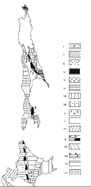 Sakhalin: 1 - Western; 2-4 - Anivo-Central-Sakhalinsky composite terrane: 2 - Central-Sakhalinsky (1) and Mereisky (4); 3 - Gomonsky (2) and Anivsky (5); 4 - metamorphic: Langeriysky (3) and Susunaysky (6); 5-9 - Eastern composite terrane: 5 - Nabilsky; 6 - island-arc: Kotikovsky and West-Shmidtovsky; 7 - Rymniksky; 8 - Elisavetinsky; 9 - East-Shmidtovsky; 10 - postaccretional complexes of Sakhaline; Hokkaido: 11 - Oshima-Rebun; 12 - Sorachi-Yezo: a-nonmetamorphic; b-Kamuikotan metamorphic complex; 13 - Idonnappu and nonmetamorphic Upper Cretaceous sequinses; 14 - Hidaka: a-nonmetamorphic; b-Hidakd metamorphic complex and Poroshiri meta-ophiolite; 15 - Tokoro; 16 - Nemuro;