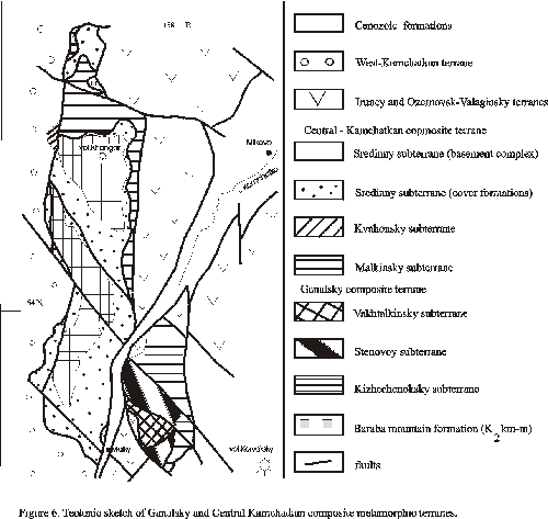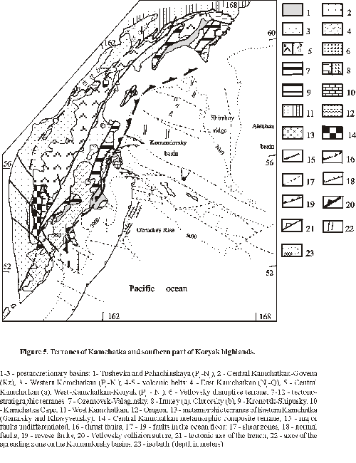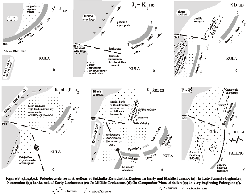 New geological materials on the composition of pre-Cenozoic complexes of Kamchatka [Zinkevich and Tsukanov, 1993] and Sakhalin [Rikhter, 1986] has demonstrated that both regions are composed of a mosaic of terranes accreted to Siberia at various times mainly in Late Cretaceous and Early-Middle Cenozoic. These terranes (fragments of island arc chains, back-arc basins, and oceanic plateaus) experienced a complex history of subduction, collision and strike-slip tectonics and played main role in the producing of the modern tectonic structure of the region.