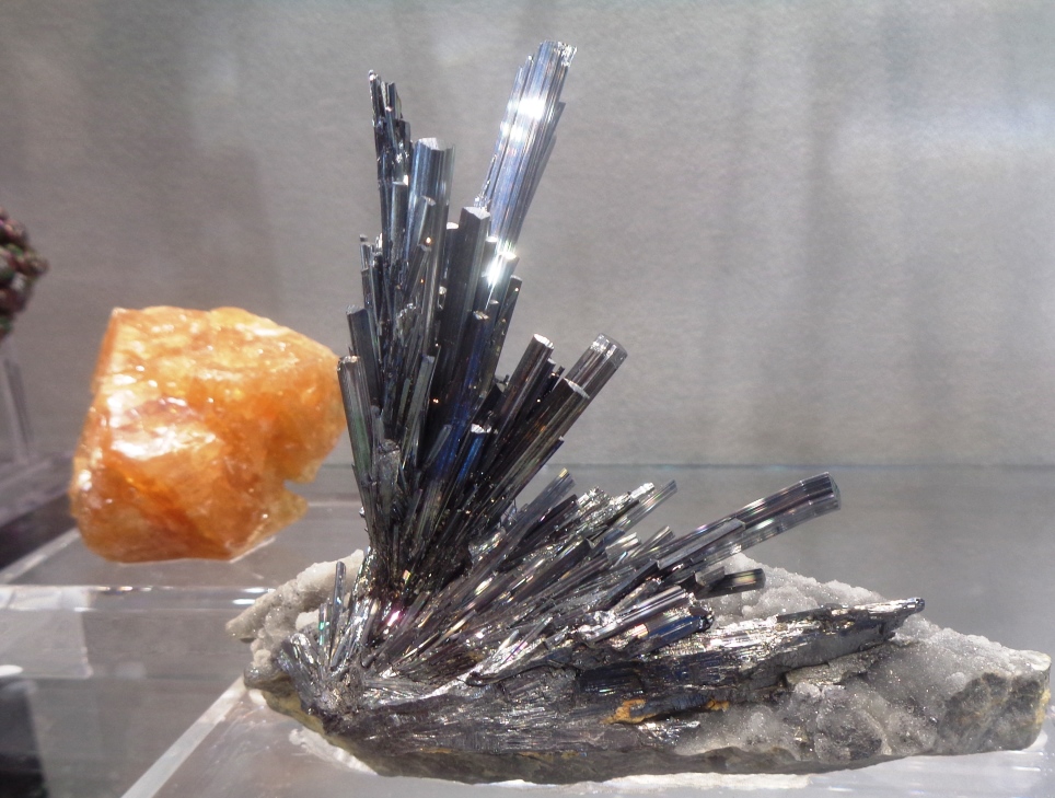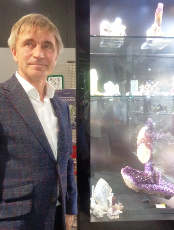 Михаил Аносов у витрины образцов компании "Русские минералы". Выставочный центр «Ивент-холл Даниловский» . Фото: А. Евсеев, 2025.10.04
