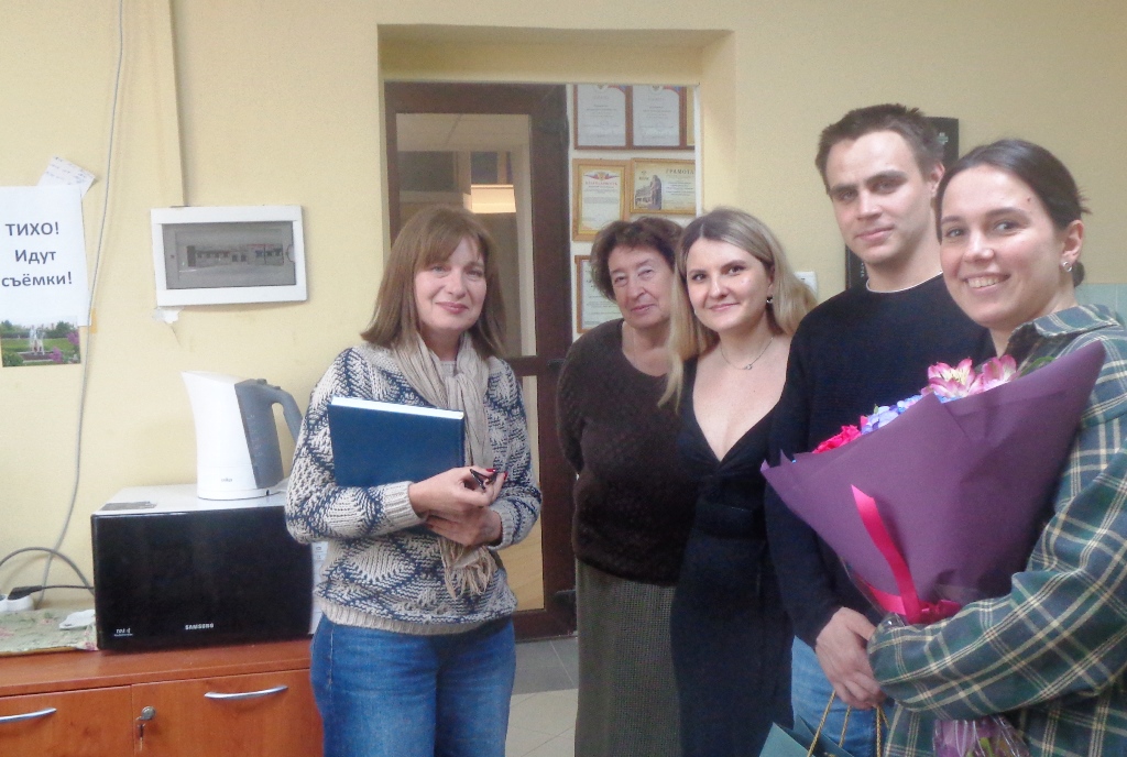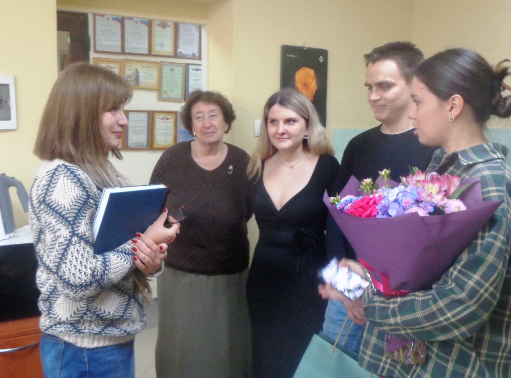 Ольга Зайцева (слева) принимает поздравления от коллег по работе. Мин. музей МГРИ. 2025.10.02. Фото: А. Евсеев.