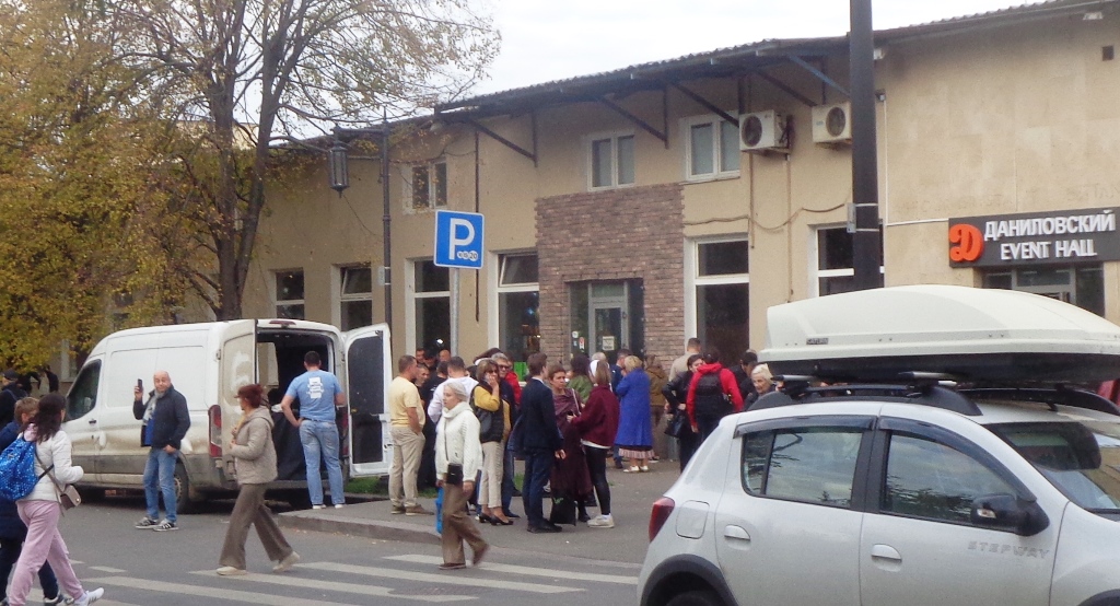 У входа на ярмарку цветных камней. Выставочный центр «Ивент-холл Даниловский». Фото: А. Евсеев, 2025.10.04