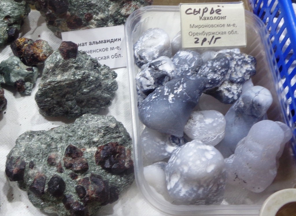 1. Альмандин. Глубоченское м-ние, Свердловск. обл, Ср. Урал, Россия. 2. Кахолонг Мироновское м-ние, Оренбургская обл., Ю. Урал, Россия