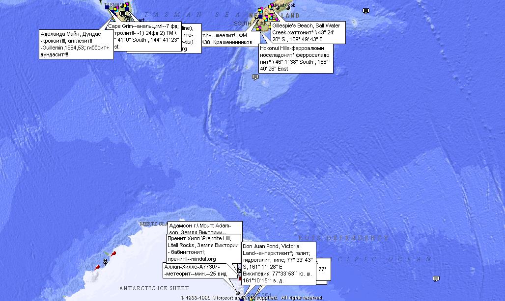 Минералогические находки \ Местонахождения минералов Тасмании, Южного о (Нов. Зеландия) и Земли Виктории (Антарктида) (примеры). Составил. © А.Евсеев. 2026.02.24